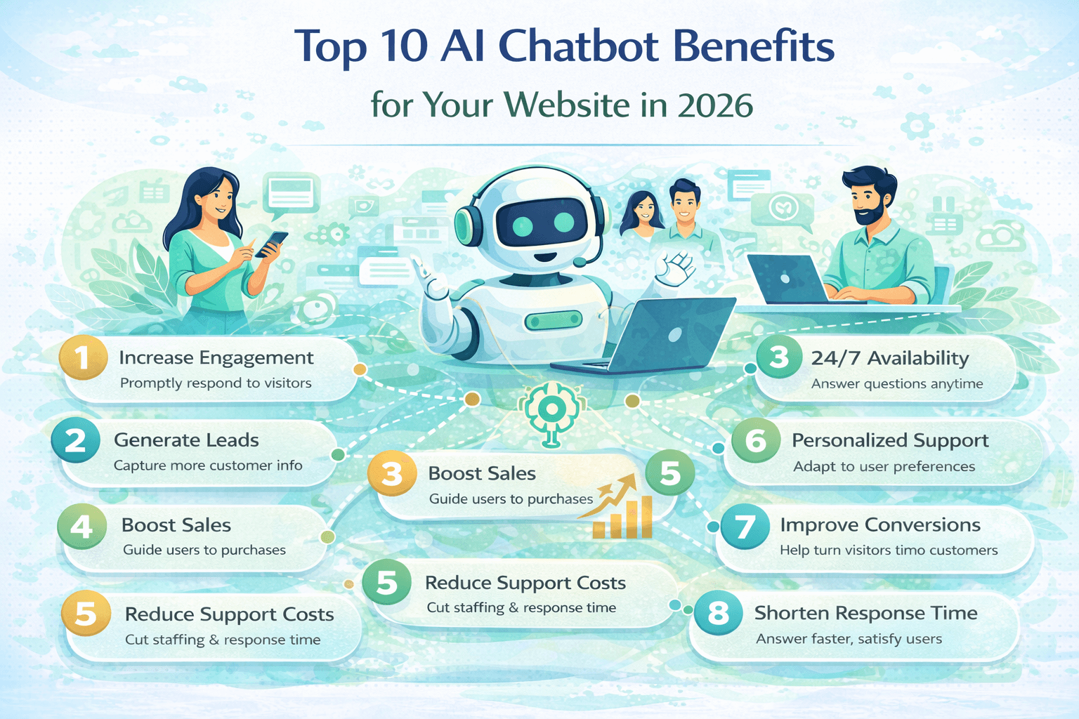Discover the top 10 benefits of adding an AI chatbot to your website in 2026 — from 24/7 support and lead capture to SEO improvements and cost savings.
